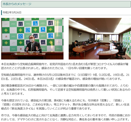 昨日付けで岩見沢市長は以下のような「メッセージ」を発信しています。