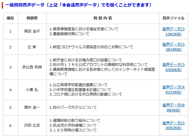 議員に音声データが渡されると同時に「砂川市議会のHP」にも素早くUPされました。