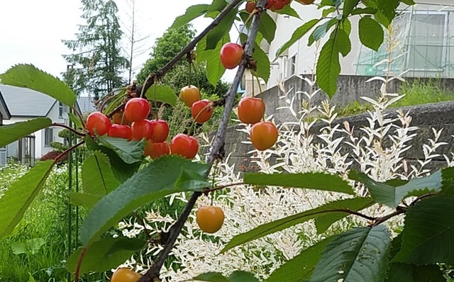 我が家のサクランボが採りごろになりました。最近は赤くなるとカラスに食べられていましたが、木の回りにヒモを張ってみるとご覧のように被害がありません。