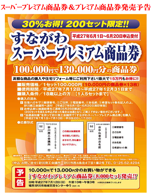 また、千円の商品券を13枚綴りにした「すながわプレミアム商品券」は1万円が1セットとなり、8000セット販売されます。