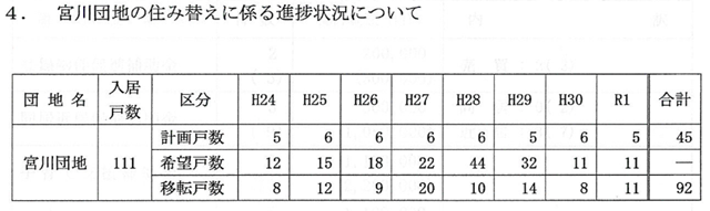 今年度は4月中旬、宮川団地19世帯のうち、すでに意向予定を確認した2世帯を除く17世帯を対象に行こう調査を行い、年度内に他の団地に住み替え希望1世帯、次年度以降の移転希望1世帯となっているようです。