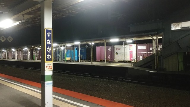 上の写真は6月中旬、砂川駅に夜行ったときに写したものですが、廃線を望む砂川駅の「1番線ホーム」に貨物列車が停まっているところです。