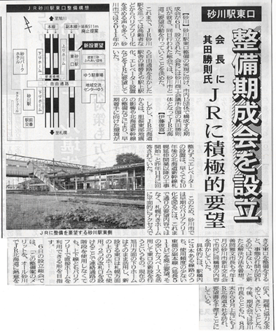 最近は更新の際、新聞報道を引用させていただくことが多くなっています。8日付けの「プレス空知」に砂川駅東口整備実現に向けた「期成会」の設立総会のことが書かれていました。