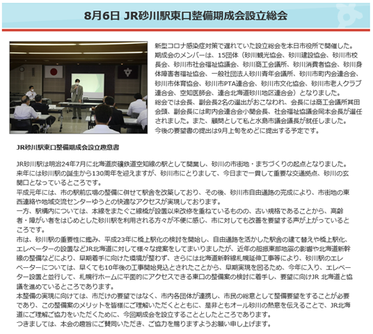昨日、私のHPに「JR砂川駅東口整備期成会」の設立総会のことを書きました。本日、善岡市長のブログを拝見しますと、その期成会のことが書いてありました。