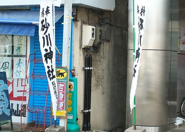 商店街には砂川神社ののぼりだけが風に揺れています。