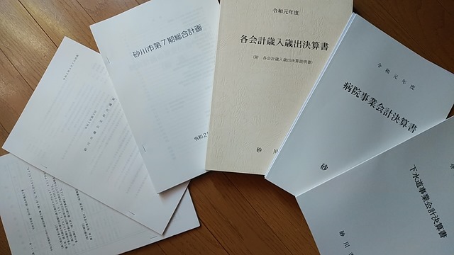 左から補正予算、議案書、第7期総合計画、令和元年度一般会計等決算書、病院事業会計、下水道事業会計決算書です。