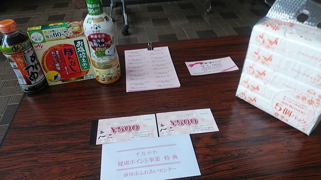 すながわ健康ポイント・カードを作られた方は豪華特典の交換を忘れずにふれあいセンターへ。