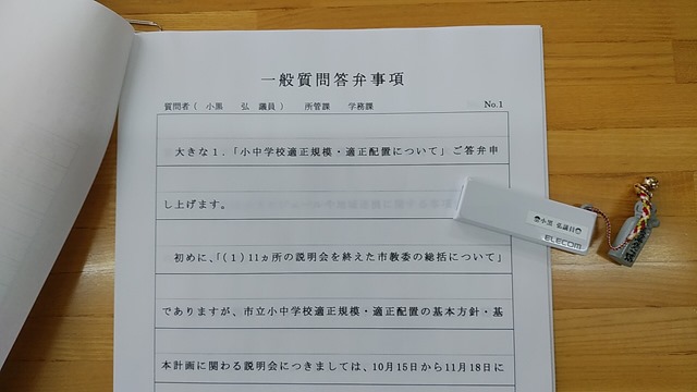 音声データには自分の一般質問の録音が入っています。写真のメモリースティックの中です。そして、「一般質問答弁事項」と書いてあるのが、本会議場で部長が1回目の質問に対する答弁が書かれたものです。