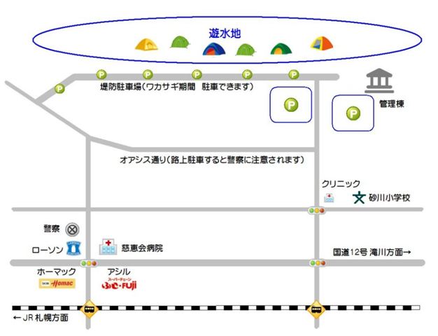 駐車場への案内地図ではオアシス通りの路上駐車は警察に注意されるそうです。ルールを守っていつまでもワカサギ釣りが続きますようご協力を!!!