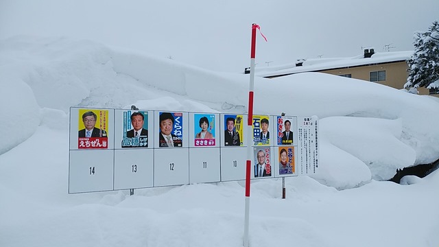 ポスターの掲示板も雪に覆われています。私がすれ違ったのは3台の選挙カーでした。それぞれの候補は『最後のお願いにやって来ました!!』。