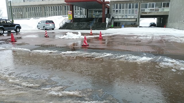 市役所前の道路は降り続く雨のため雪が解けて、ご覧のような状態になっていました。