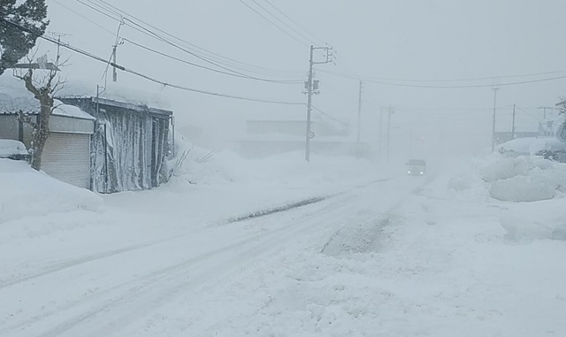 写真は午後4時ごろの我が家の前ですが、車もライトを点けながら走らないと危険です。すぐ近い住宅や信号機も見えないほど。また、風が強く、顔に雪が水平に刺さってくるようで痛いです。この原因は