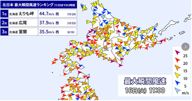 えりも岬での最大瞬間風速は44.7mと言うことは、砂川の倍以上。