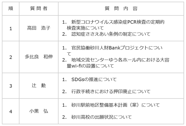 砂川市議会のHPには一般質問を行う議員の質問項目だけが掲載されています。以下の通りです。