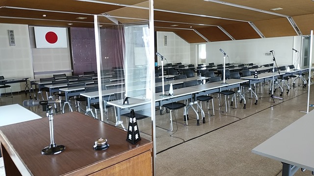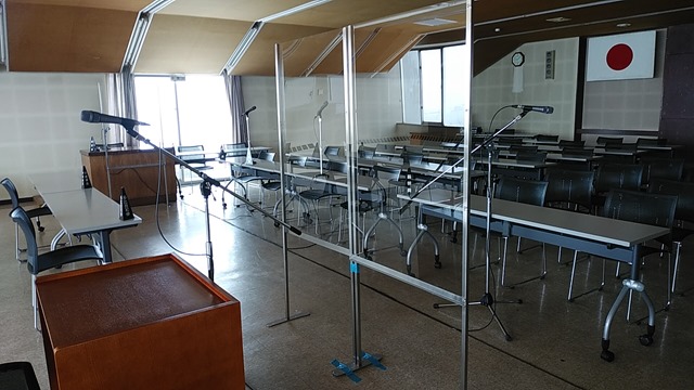 委員長席の前にアクリル板が設置されました。写真のアクリル板の向こう側は市長を始め答弁する部課長の座る席です。