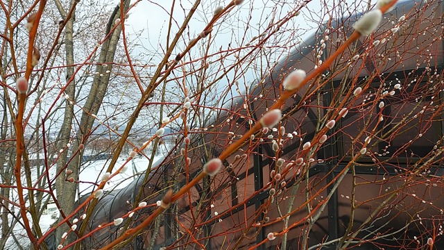 少々疲れて家に帰る途中でネコヤナギの花穂を見つけました。