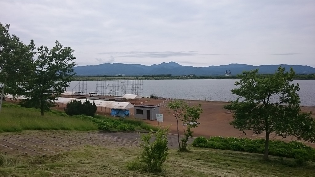 また、右下はオアシスパークですが、来週の4日、5日と開催される「The 祭」の準備のためか、テントとステージが組まれていましたし、ウィンドサーフィン、水上バイクで楽しんでいる方々も。
