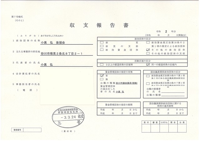 議員は政治資金規正法の取り決めにより3月31日までに提出する必要があります。
