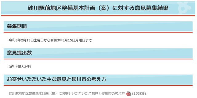 砂川駅前地区整備基本計画(案)意見募集の結果