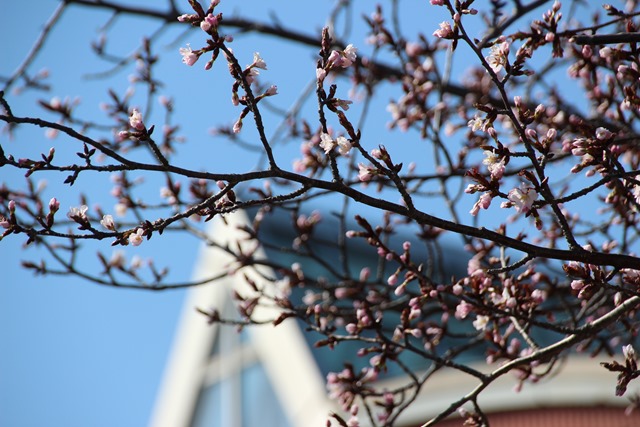 蕾はまだ固いのですが、砂川市立病院高等看護学校の前のさくらが咲き始めました。