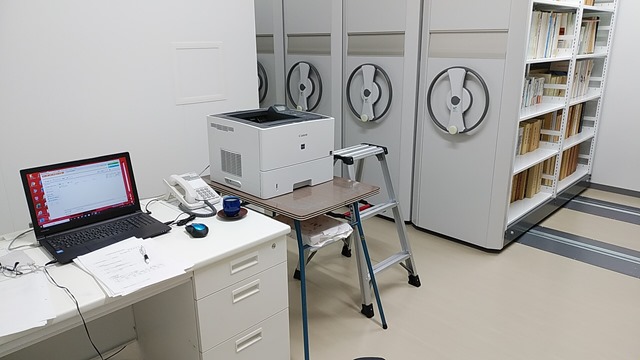 新庁舎でのパソコンがある部屋は議会図書室の一角。後ろの書庫は議会関係の図書と会議録等が収納されています。