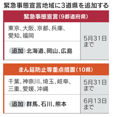緊急事態宣言を5月16日から5月31日まで北海道と岡山県、広島県を追加する方針を示しました。