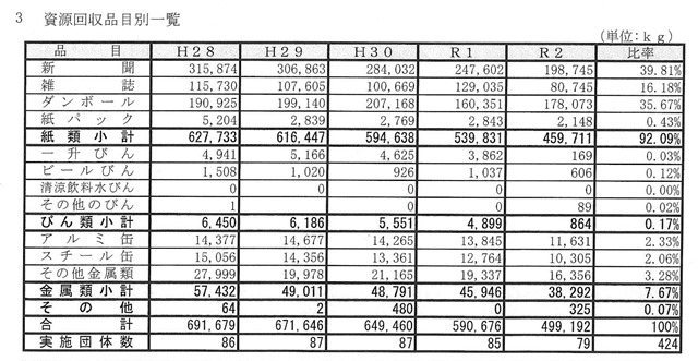 下の表は「砂川市衛生組合」から届いたものですが、「資源ごみ団体回収の状況について」です。
