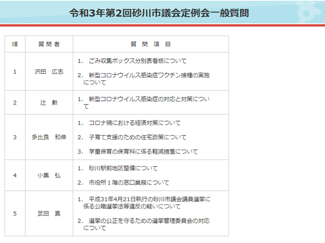 ちょっと見づらいので砂川市議会のHP「令和3年第2回砂川市議会定例会一般質問」にリンクします。