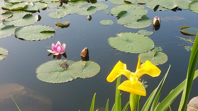 大きな鯉がたくさん泳いでいる池のスイレンの花が咲き始めました。続いて我が家のサクランボ