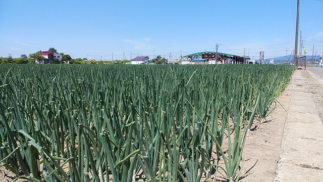 ここは玉ねぎ畑ですが、最近、雨も降らず暑い日が続いていて土がカラカラに乾いています。大きく育っているようですが、一雨欲しそう。