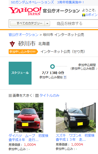 上の写真はヤフーの「官公庁オークション」です。砂川市も市税等滞納処分により差押えた財産について、ヤフーのインターネット公売システムを利用して公売を実施することになったようです。
