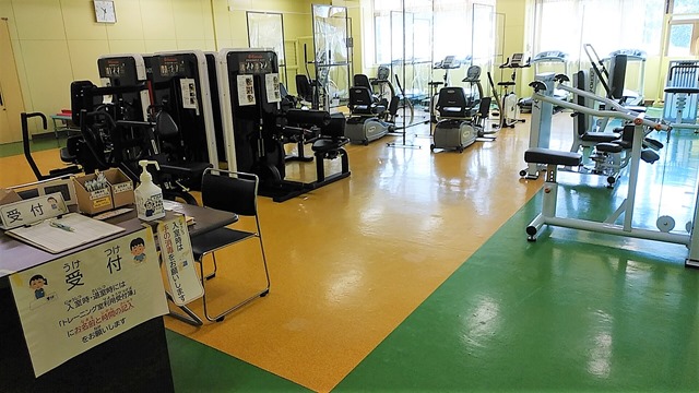 以前は柔道場で畳が敷いてありましたが、すっかりイメージチェンジです。まずは受付をして、地域おこし協力隊のトレーナーさんとトレーニングメニューを話すところから始まります。