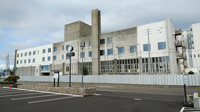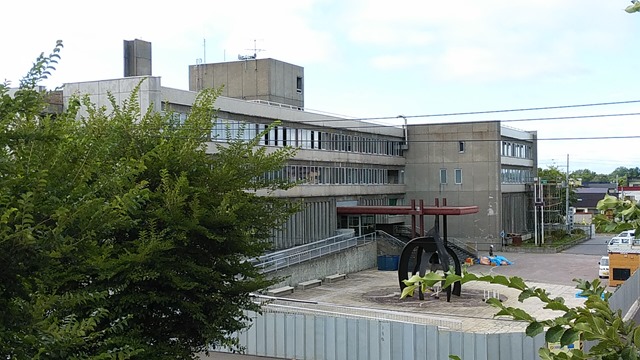 こちらは正面側ですが、工事用の塀で囲まれているので、市立病院の立体駐車場から撮ってきました。国松明日香さん作のモニュメントは旧庁舎解体後にできる駐車場内に残ります。