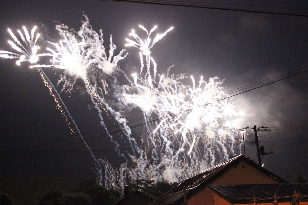 花火を近くで見るには、砂川市のラブリバー「夏まつり」で行われる花火大会(8月7日午後8時より)は素晴らしい会場ですが、花火の多さと写真左のように民家のすぐ側でスターマインの下の花火がさく裂するのは豪快でした。