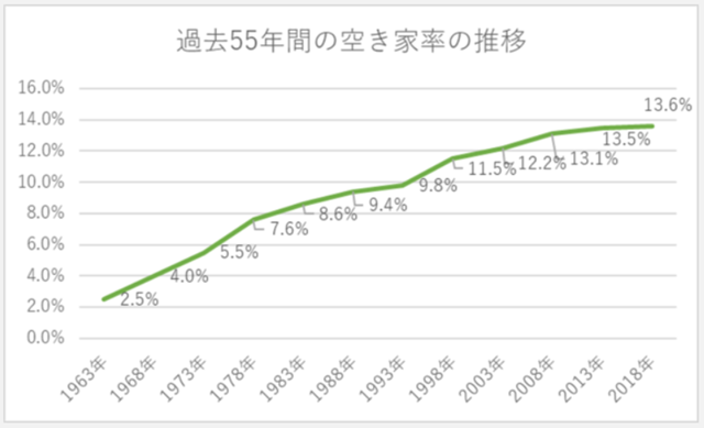 少し古い資料ですが、全国的に空き家率は増加して来ています。下のグラフは住宅土地統計調査のデータを元にしたものです。