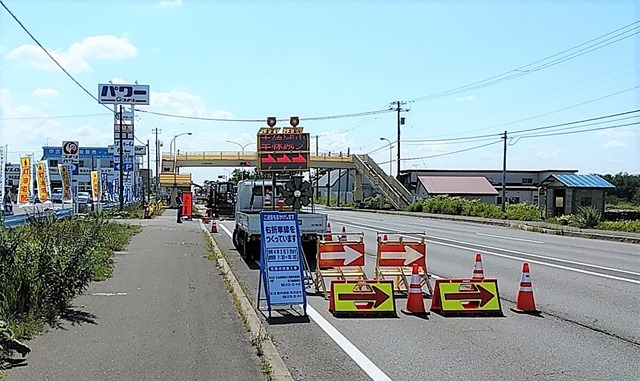 この看板の「右折車線をつくっています」は、反対車線(旭川方面)の右折車線のようで、砂川の中心街からコメリ前の信号を右折する時の専用車線をつくる工事。これまで右折時の事故がけっこう多かったとのこと。