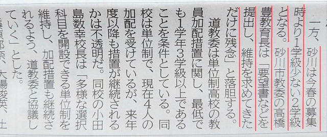 つまり、砂川高校の募集定員は平成31年度に2学級となったことで、学級数は「2」になっていて道教委の特例で「3」が続いていたのではないでしょうか。道新の記事内の下の写真を見ると