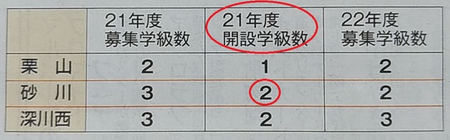 注目は赤い丸で囲んだ部分です。見出しに「砂川据え置き」とあります。今年の募集は3学級(120人)だったので、「据え置き」とあれば3学級が確保されたとも思えますが、来年の募集は2学級(80人)となりました。