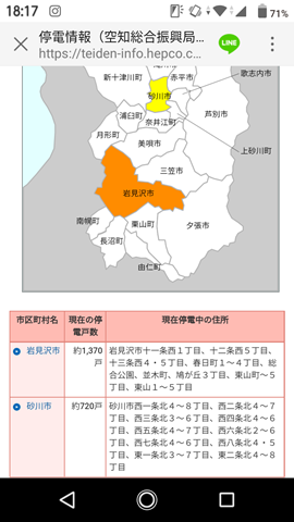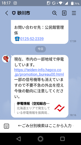 砂川市のラインから届いた情報は上の写真左の内容でした。我が家の停電は無かったのですが、すぐ近くの雷だったので、情報が知りたいと思っていた矢先。リンク先をクリックすると市内の停電場所が掲示されていて、非常に役に立ちました。