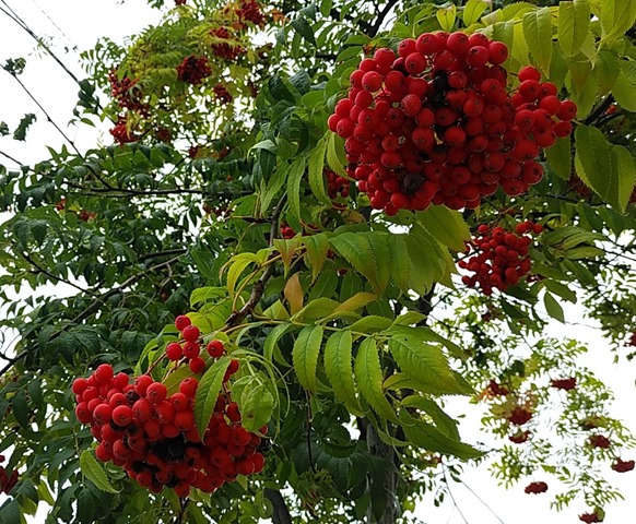 赤い実はナナカマドの実ですが、すごくビッシリ付いています。もうすでに真っ赤。そして、右の写真は私が今年初めて間近で見た「雪虫」。