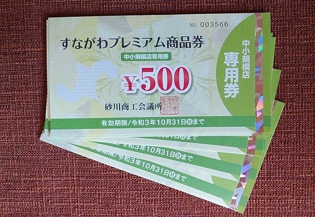 上の写真は6月に販売された50%のプレミアムが付いた商品券です。先日発売された「飲食店応援券」とデザインも似ていますが、こちらの有効期限は10月31日まで。