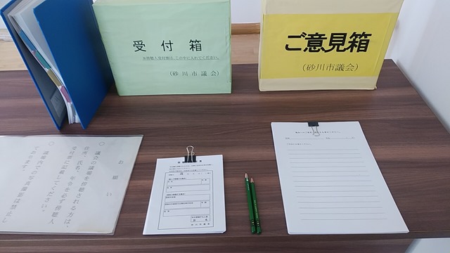 中に入ると傍聴席がありますので、好きな席にお座りください。また、出入りは自由です。ただ、今はまだコロナ禍でありますので、入口前での手指消毒とマスクの着用だけはお願いいたします。