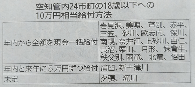 これを見ると砂川市も「年内から全額を一括給付」の欄に入っているで、そう決めたんだと思っていました。でも「年内から」ってどういう意味だろう?「年内に」の方が分かりやすいけど・・・。