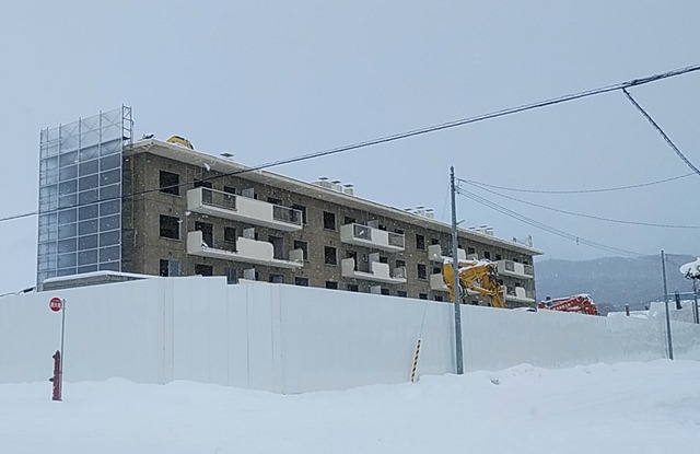 市内の住宅地「石山団地」にある大きなアパートで工事が行われていました。前から気にはなっていたのですが、本日の様子は上の写真です。