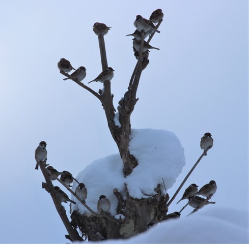 近くの木にマルマルと太った(寒いからですネ)美味しそうなスズメ達がたくさん木に留まっていました。