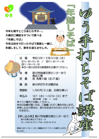 地域交流センター「ゆう」の主催「手打ちそば講座 年越しそば」が開催されました。講師は「砂川手打ちそば愛好会」です。