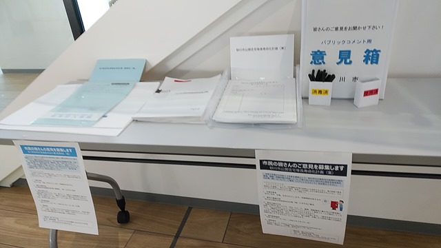 市役所のロビーに設置されたパブリックコメントのコーナーですが、遠くから見た瞬間『市役所にもご意見箱が置かれたか!!』って感激して、よく見るとパブリックコメント用と書かれていました。