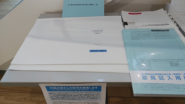 現在、2件のパブリックコメントが実施されています。右が「砂川市公営住宅等長寿命化計画(案)」で左の水色の用紙が「砂川駅前地区整備基本設計書【概要版】(案)」です。近づいてみます。