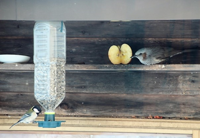 ヒヨドリは古米よりリンゴが好きなようで、リンゴを食べて、スズメは古米を。上の写真はヒマワリの種を食べるシジュウカラとヒヨドリを撮りました。