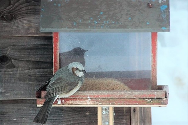 ヒヨドリがやって来ました。しかし、スズメ用の古米が入ったエサ台に陣取っていますので、スズメが食べに来られず回りでバタバタしています。